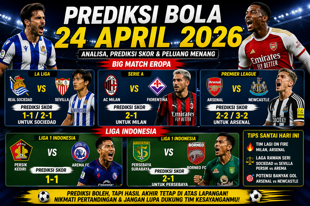 Prediksi Bola Hari Ini 24 April 2026: Dari Duel Panas Eropa Sampai Derby Lokal yang Bikin Tegang , Kalau kamu lagi cari prediksi bola hari ini, selamat… kamu sudah berada di tempat yang tepat 😄
